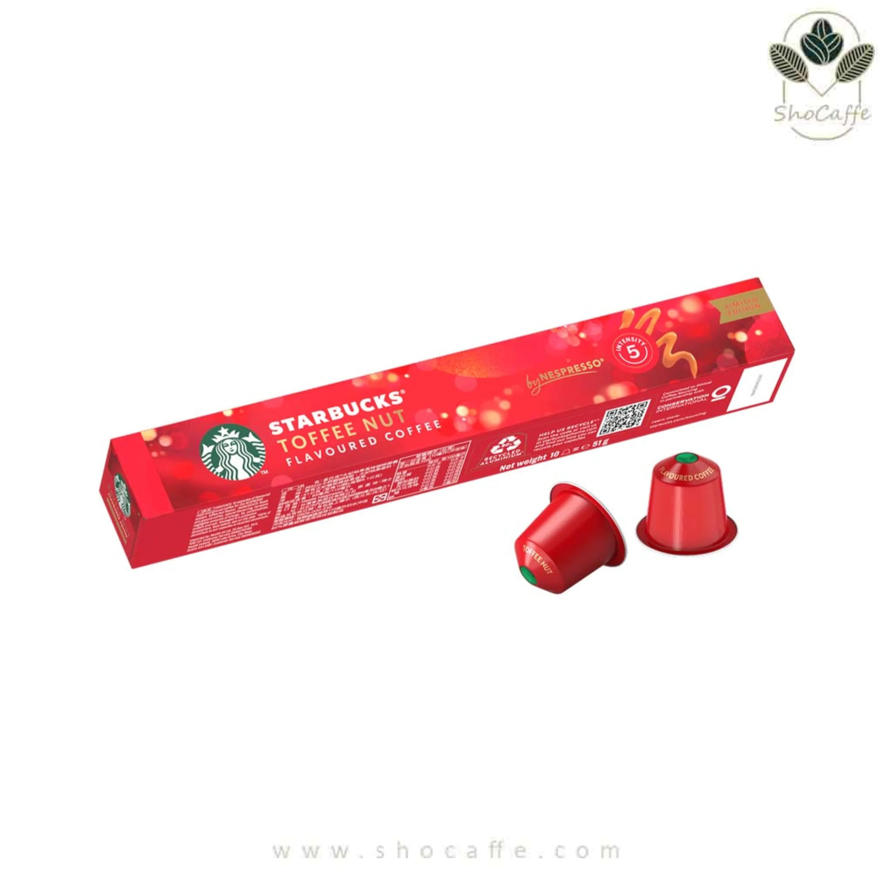 هر بسته کپسول استارباکس نسپرسو مدل تافی نات با درجه تلخی 5 ؛ از 10 عدد کپسول آلومینیومی تشکیل شده است. این کپسول مملو از طعم غنی و کره ای تافی شیرین و آجیل برشته شده است. شما می توانید از هر کپسول ، نوشیدنی ای به حجم لانگو (110 میلی لیتر) و همچنین با توجه به توصیه استارباکس می توانید آن را به صورت ترکیب با شیر سرو کنید و از نوشیدنی خود لذت ببرید.