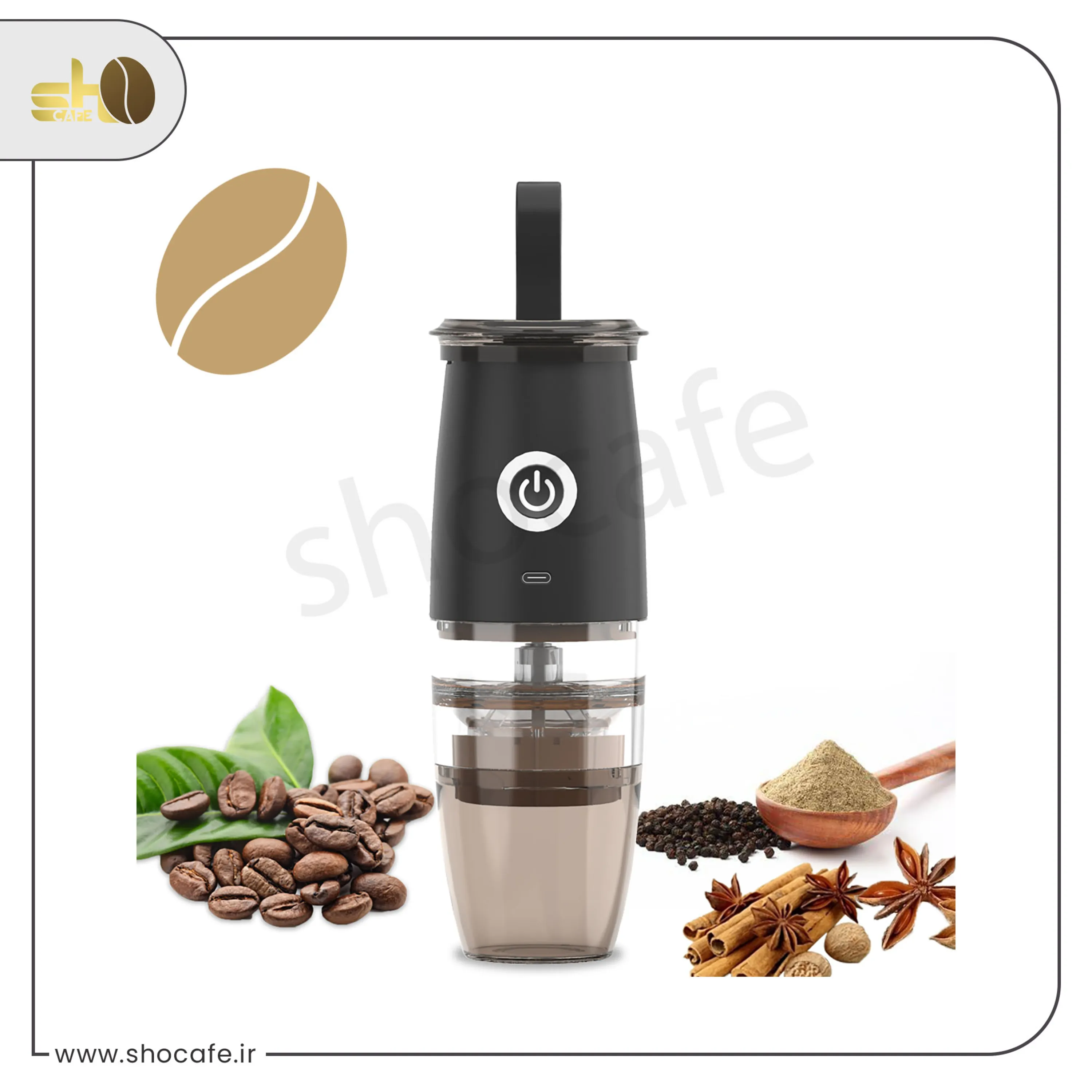 آسیاب قهوه شارژی مدل KF-YM-01 با بدنه ی شفاف طراحی شده به گونه ای که عملیات آسیاب قهوه به خوبی دیده می شود.